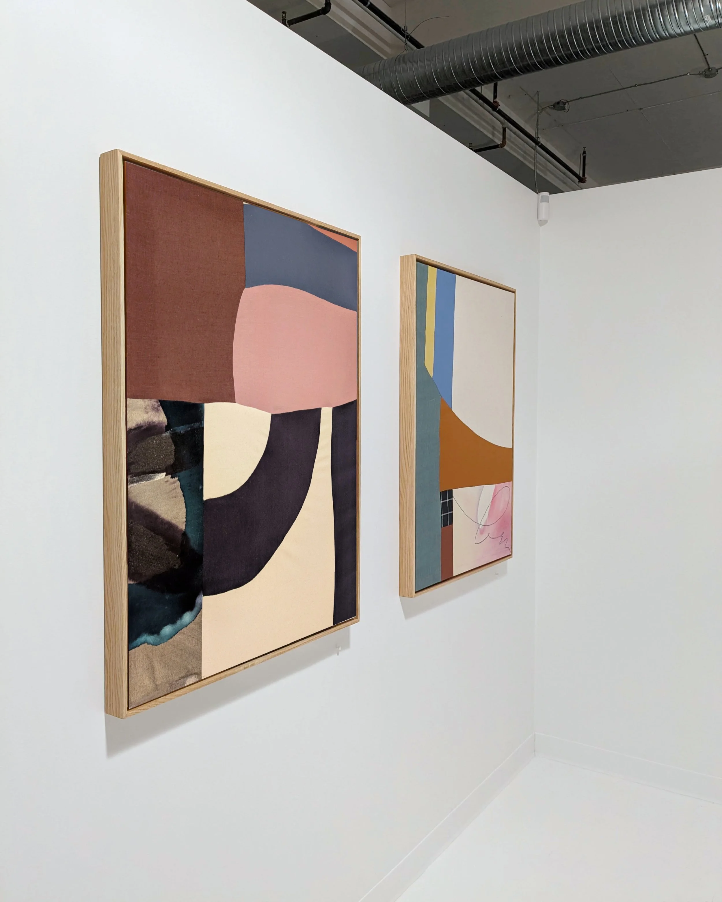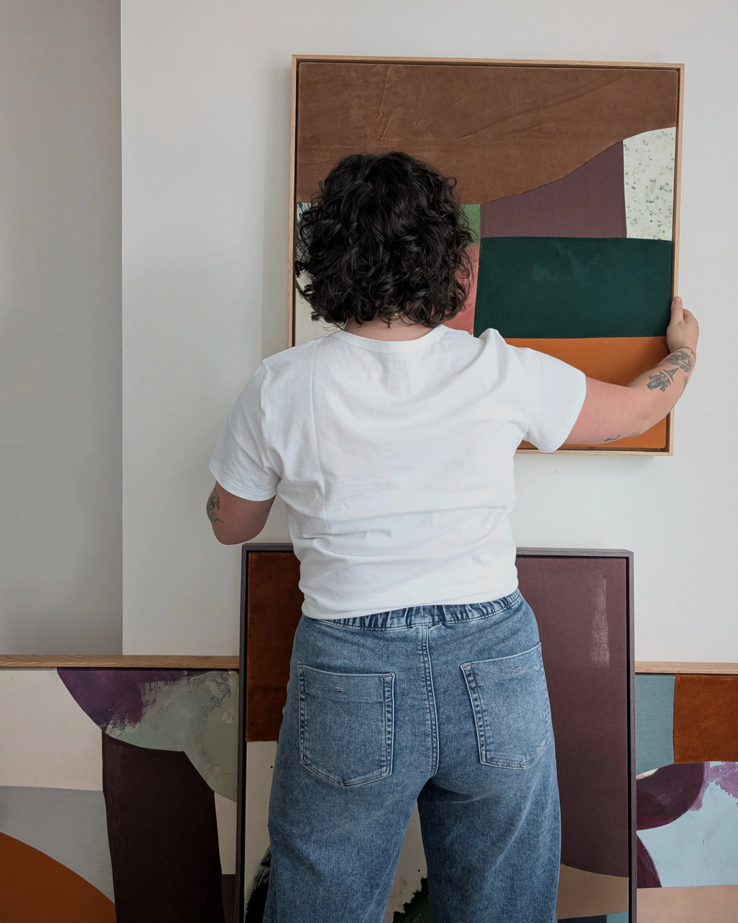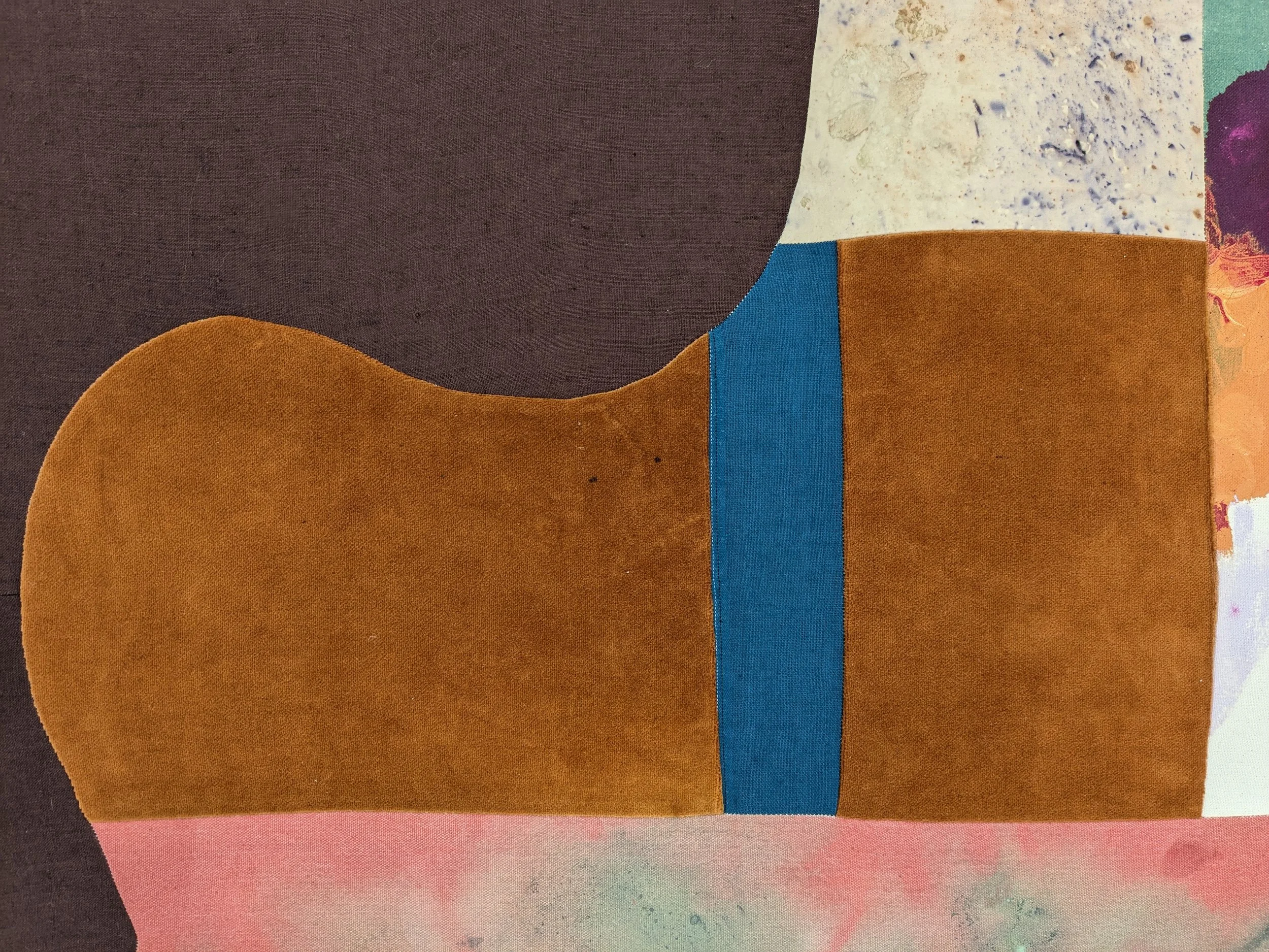 She combines repurposed painted canvas with thrifted and hand dyed textiles. Sewn on the reverse, her pieces appear to be paintings, but wonderful textures and areas of tension created by needle and thread reveal a visual world to explore.
